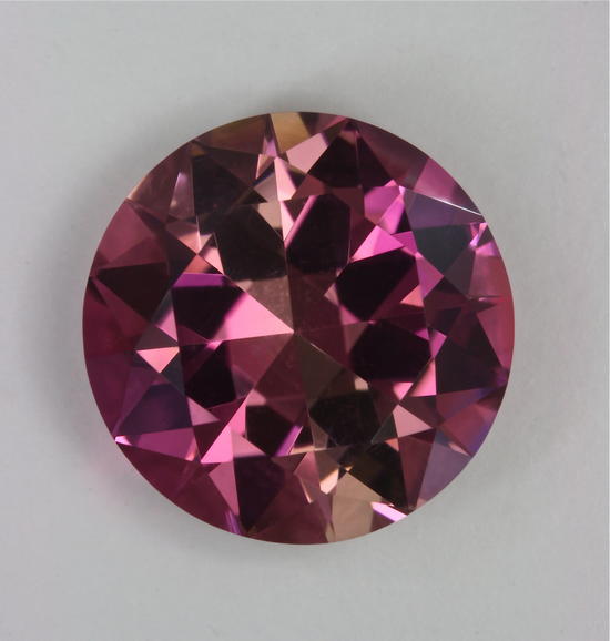 I would have cut this standard round brilliant with its table perpendicular to the principal (c) axis if it was reasonable. It wasn’t, so I cut the emerald cut with the table parallel to the c axis. With that orientation you get alternating slices of pie with both dichroic colors appearing face up in the round. In this case the c axis color is a nice bright pink and of course dominates, but doesn’t eliminate the paler a/b. When people look close enough at the gem, they find it surprising to see the four slices of a beautiful pie. This is a good sized pie at 7.51 carats. It is eye clean and of excellent crystal.