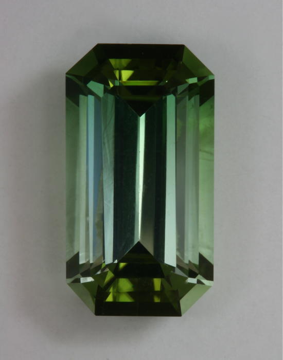 This attractive and interesting emerald cut is not a bicolor or tricolor. It is just one bright acid green color displayed along the long axis of the stone from very pale to a dark tone. There is a darker end in the emerald cut, next to the pale part, that comes from what I call the pagoda effect. The color comes from the dark end and the stone guides the green color down the long axis of the stone to the lightly toned end where it emerges from the gemstone. This effect can be strong enough to make you think that both ends of a graded gemstone like this have the same tone value of the color.